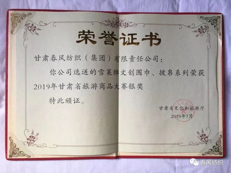絲綢之路旅游商品展覽會(huì)暨2019年甘肅省旅游商品大賽參賽商品評選于8月1日下午揭曉,春風(fēng)雪萊公司代表集團(tuán)公司參賽的“雪萊”牌文創(chuàng)披肩、圍巾系列產(chǎn)品榮獲銀獎(jiǎng),也是天水市選送的23個(gè)產(chǎn)品中唯一的獲獎(jiǎng)產(chǎn)品。本次大賽共有來自全省各地選送的近700個(gè)商品參與評選,共選出金獎(jiǎng)1名,銀獎(jiǎng)5名,銅獎(jiǎng)8名。